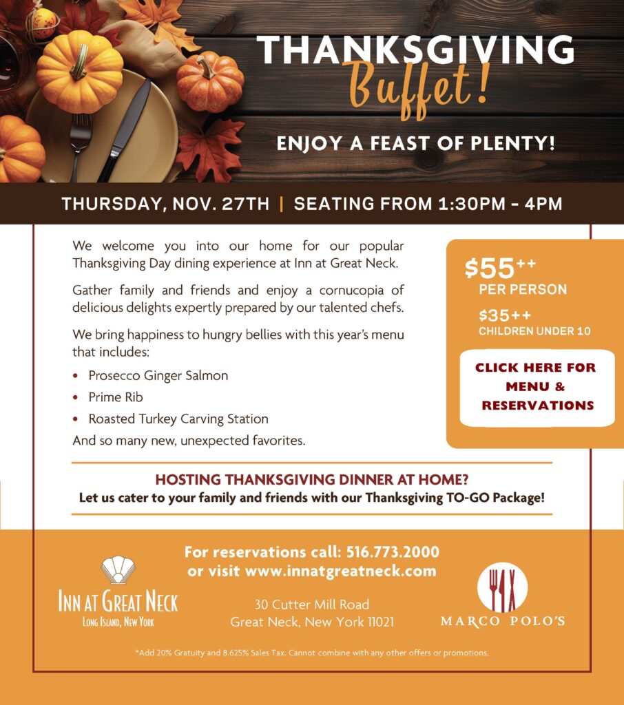 Enjoy a casual dining experience at Marco Polo’s Bar & Restaurant located in the lobby of Inn at Great Neck. Our friendly and knowledgeable wait staff is ready to meet and exceed your expectations. Our menus use the freshest seasonal ingredients with a unique Asian/Italian flair. View Menu or Order Online